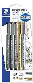 Staedtler Pigment Liner & Metallic Marker, Ensemble créatif incluant 3 feutres fins à encre noire infalsifiable et 2 feutres à encre métallique, Livrés sous étui blister, 308 SBK3P3