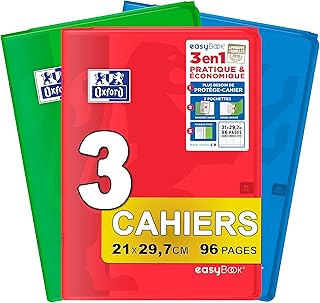 Oxford EasyBook Lot de 3 Cahiers Agrafés Grands Formats 24 x 32cm 96 Pages Grands Carreaux Seyès 90gr Couleurs Assorties