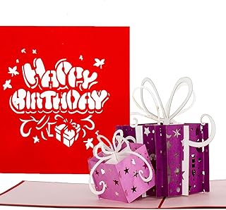 Carte d'anniversaire « Cadeaux – Happy Birthday » rouge et violet – Carte pop-up, carte 3D, carte pour anniversaire, carte de félicitations, fête, naissance